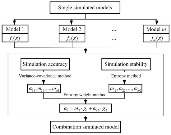 For the simulation accuracy index, the relative weight for each single model was determined by the variance–covariance optimization combination method. Considering there are m single models, f 1 ( t ) , f 2 ( t ) , , f m ( t ) are the simulation results; σ 1 , σ 2 , , σ m are the variances of the simulation errors, and the errors of the models are not correlated; and ω 11 , ω 21 , , ω i 1 are the relative weights of each single model. Thus, the simulation results of m models are as follows: