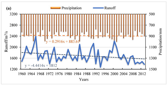 Faced with the increase in population around the world, agricultural water management, as a controversial issue, is important in the efforts to maintain food security. The interactions and feedbacks between human activities and water cycle dynamics, combined with the evolution of human values in relation to water, are creating what have been considered as emerging “big problems” [1]. As the link in the interaction of human activities and the water cycle, runoff plays an increasingly important role in the balance of the ecological value of water and agricultural water management [2]. It is one of the important water sources for downstream agricultural water, and it plays a significantly important role in downstream agricultural irrigation [3]. Especially, the runoff at the downstream of reservoirs is a kind of stochastic process with uncertainty and variability [4,5]. In order to understand and manage the interactions of humans and water in the river basin management, it is important to quantify the impact of human activities and climate change on runoff based on process modeling and statistical analysis.