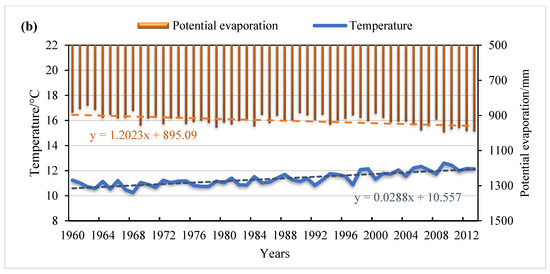 The annual mean runoff and precipitation are shown in Figure 3a. The annual mean runoff of the Lancang River basin is 1690 m3/s; the maximum runoff (2396 m3/s) appeared in 1966 and the minimum (1278 m3/s) in 1994; and the runoff has a decreasing trend of 4.4 m3/s per year. The annual mean precipitation is 892 mm; the maximum (1026 mm) appeared in 2000 and the minimum (778 mm) in 1992; and the precipitation has an increasing trend of 0.29 mm per year. Additionally, the annual mean evaporation and air temperature are shown in Figure 3b. The annual mean potential evaporation is 928 mm calculated with the Penman evapotranspiration formula; the maximum (997 mm) appeared in 2009 and the minimum (844 mm) in 1962; and the potential evaporation has an increasing trend of 1.2 mm per year. The annual mean air temperature is 11 °C; the maximum (13 °C) appeared in 2009 and the minimum (10 °C) in 1968; and the air temperature has an increasing trend of 0.03 °C per year.