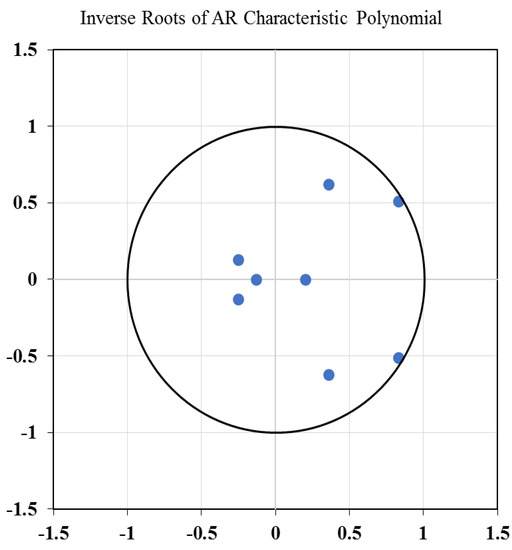 To avoid invalid results due to model instability, the most important task is to estimate the stationarity of the constructed VAR model. Therefore, the unit root estimation method was adopted to test the stationarity of the VAR model, that is, the modulus reciprocals of all the unit roots are in the unit circle (radius is 1), which means the constructed model reaches the stationarity standard to continue with further analysis for impulse response and variance decomposition.