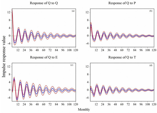 The VAR model was adopted to quantitatively analyze the impact of each meteorological factor on runoff. The impulse analysis showed convergence and the long-term response gradually weakened, tending to 0, indicating that a standard deviation impulse for the four groups of factors has a strong response to runoff changes. In addition, it was concluded from the results of the response of runoff to the three climatic factors that runoff has a positive response to precipitation variations but has a negative response to the changes in potential evaporation and air temperature.