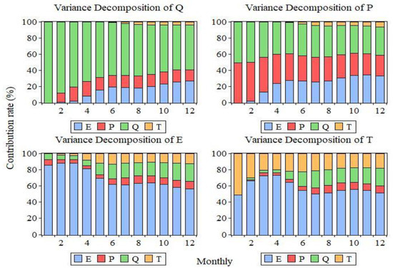 The variance decomposition method was adopted to quantitatively estimate the contribution rates of hydro-meteorological factors to runoff changes. However, different from IRF, the contribution of each endogenous variable in the system to the total can be calculated using the variance decomposition method.