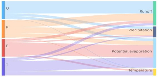 The interaction of the four hydro-meteorological factors is shown in Figure 10, and it can be concluded that, of the four factors, runoff had the greatest impact on itself and precipitation; potential evaporation had the greatest impact on itself and air temperature; and the impact of precipitation on itself ranked second—it had the greatest impact on air temperature. The contribution rates of precipitation and potential evaporation to runoff were both about 14%, and air temperature was about 2%. For precipitation, the contribution rate of runoff to precipitation was dominant (40%), and the contribution rate of potential evaporation was about 23%, with that of air temperature being the lowest (only 3%). For potential evaporation, the contribution rates of runoff, precipitation and air temperature were, respectively, 14%, 7% and 9%, and the contribution rate of air temperature to potential evaporation increased notably compared with that of air temperature to runoff and precipitation. For air temperature, the contribution rates of runoff and precipitation were 13% and 5.6%, lower than to itself. Figure 11 presents the process graph for dynamic response of the hydro-meteorological factors (line width represents the contribution rate), with the contribution directions and amounts being shown clearly.