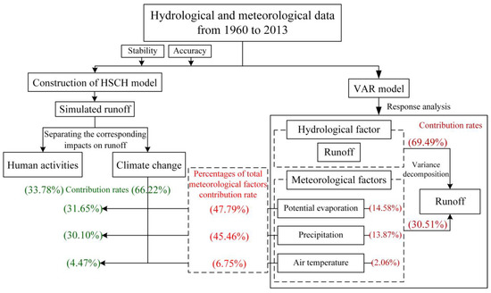 Figure 12 shows the impact of human activities and climate change on runoff by the CHSH model, and the contribution rates for human activities and total climate change were 34% and 66%, respectively. To further separate the contribution rates of the meteorological factors to runoff, the VAR model was constructed and, by the variance decomposition method, the impact of hydrological and meteorological factors on runoff were 69% and 31%, respectively. Among the meteorological factors, the contribution rates of potential evaporation, precipitation and air temperature were 15%, 14% and 2%, accounting for 48%, 45% and 6.8%, respectively. Therefore, the impact of climate change on runoff (contribution rate of 66%) is divided into 32% (for potential evaporation), 30% (for precipitation) and 4.5% (for air temperature), as shown in Figure 12.