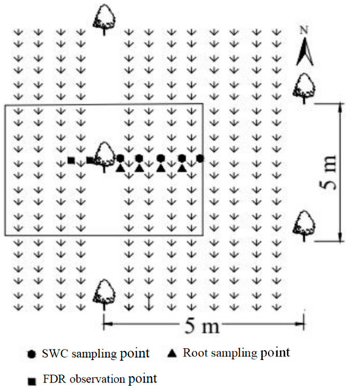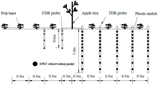 Time-domain reflectometry (TDR) probes (TRIME-PICO-IPH, IMKO, Ettlingen, Germany) were used to measure SWC after sowing at observation points set at 0.3, 0.8, 1.3, 1.8, and 2.3 m from the tree row (Figure 2) and soil depths of 0–10, 10–20, 20–30, 30–40, 40–50, 50–60, 60–70, 70–90, 90–110, and 110–130 cm. Calibration was carried out using the drying method.