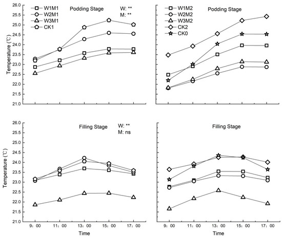 The diurnal variation of soil temperature in the podding and filling stages showed an initially increasing followed by a decreasing trend (Figure 4). The highest temperature in the podding period occurred at 3 pm, while the highest temperature in the filling stage occurred at 1 pm. The temperature of the control group showed a rapid rate of increase with a large change range and was significantly higher than that of other treatments. Increased irrigation level in the M1 group caused the soil temperature to initially exhibit an increasing trend, which then decreased, suggesting that the highest soil temperature in a decreasing order was detected in W2 followed by W1, with the lowest in W3, while the temperature of W2M1 was ~0.32–7.97% higher than that of other treatments. In the M2 group, the soil temperature decreased with the increase in irrigation level at the filling stage, indicating that the soil temperature was highest in W1, followed by W2, and lowest in W3. The temperature of W1M2 was ~0.20–5.99% higher than that of other treatments, while the soil temperature at the podding stage was higher than that at the filling stage.