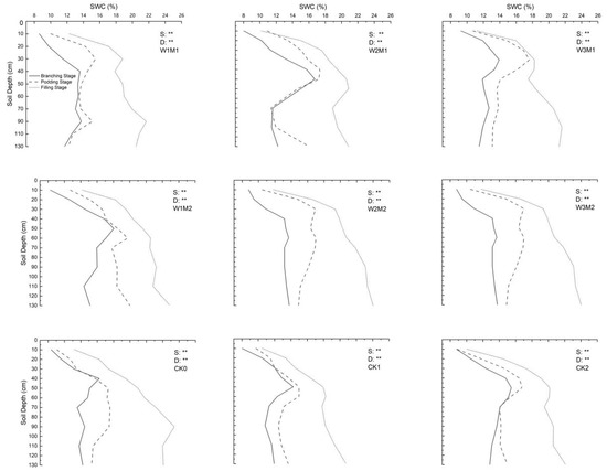Vertical variation of soil water content during soybean growth period. Note: ** was highly significant (p < 0.01). S is the growth period; D is the soil depth. The same below.