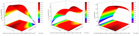 The nonlinear multiple regression results between irrigation level, temperature, and physiological parameters are shown in Figure 7. In this study, factors were normalized, and the quantitative relationship between irrigation, temperature, soybean WUE, Pn, and GY were obtained. Results showed that WUE, Pn, and GY did not reach the maximum value of the fitting in the same treatment. However, under the same irrigation and temperature levels, WUE of W1M1 treatment, GY, and Pn of W3M2 treatment could reach the maximum value of the fitting equation. In addition, irrigation, temperature, soil water, and heat coupling had significant effects on soybean WUE and GY (p < 0.05).