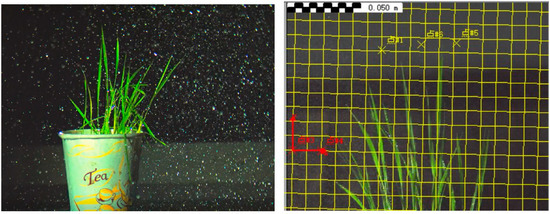 The target is placed directly below the electrostatic nozzle, and the shooting position of the camera is at the same level as the target. As shown in Figure 3, the camera and light source angles were adjusted, and a clear field of view is selected in the area near the leaf deposition of fog drops for shooting. The test environment is a dark room without the influence of cross wind. The spray pressure is set at 0.2 MPa, the charging voltage is set at 0 and 14 kv, respectively, and the spray height is set at 1.5 m. After the spray is stabilized, the camera begins to shoot. The shooting speed is set at 4000 frames per second and the resolution is 1080 × 960. After shooting, the images are saved to the corresponding format of image processing and analyzed by TEMA 2D analysis software (high-precision motion software developed by the Swedish company Image-System) [26].
