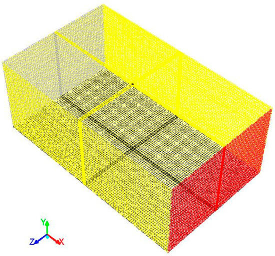 The center of the electrode was set as the origin of coordinates, and the final fluid domain was established including six parts: Electrode, inlet, outlet, top surface, ground, and side. The number of nodes in the three directions is set to 50, 60, and 30, respectively. The steam content at the outlet was used as the index to test the grid independence. The total number of grids reached 456,909 when the outlet water vapor content did not change. The mesh mass unit is 0.4, which meets the compliance standard, as shown in Figure 4. In the computational domains for the cross wind stage of simulation, the airflows were created along the X direction. The two ends in the X direction were set as the velocity-inlet and pressure-outlet. The other boundaries for the sides, top, and bottom were set as a no-slip wall.