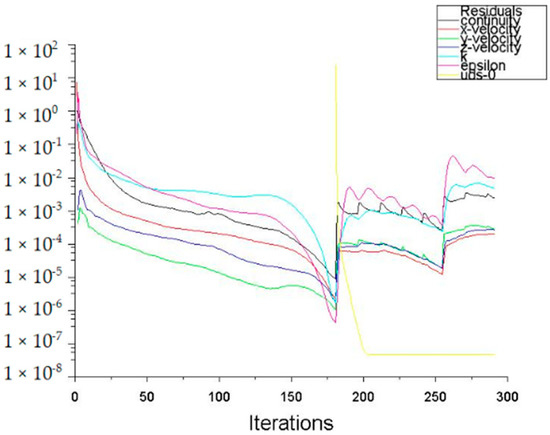 At the initial stage of calculation, the flow field is set as the steady state, and the gravity direction is selected as −9.8 (kg·m−2). Under the control of turbulent k-e model, the fluid inlet is set as the velocity inlet and the fluid outlet as the pressure outlet. The side and top are symmetric boundaries, and the residual curve is obtained by parallel calculation, as shown in Figure 5. After the residual calculation converges, it shows that the state of single-phase flow is convergent. Then, the convergent single-phase flow field is considered as the initial field of dynamical proton model (DPM), and the serial is used to set the DPM model in FLUENT. After the DPM model is set up, the potential field is constructed. Different charging voltages of 0, 14, and 20 kv, respectively were set to the electrodes. The droplet density is set to 998.2 (kg·cm−3). Since the strength of the electric field is uncertain, it is obtained by taking the derivative of the electric potential. In this paper, the electrostatic field is programmed with MATLAB to obtain the field intensity in three directions, and the electric field force is obtained by multiplying with the charge quantity. Algorithm 1 is provided in the paper.