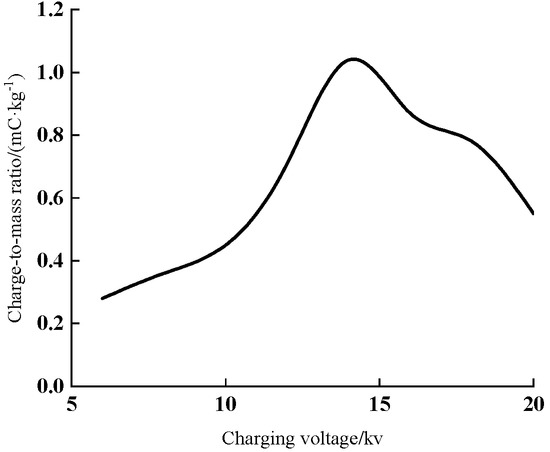 The measurement results of the droplet charge-mass ratio under different charging voltages are shown in Figure 8. The charge-mass ratio reaches the maximum of 1.04 mC/kg when the charging voltage is 14 kv. The charge-mass ratio does not increase with the increase in charging voltage when the charging voltage exceeds 14 kv. At this time, the voltage corresponding to the maximum charge-mass ratio is the limit operating voltage of the electrostatic nozzle.