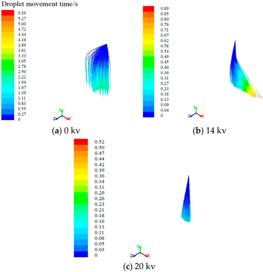 As shown in Figure 11, the movement trajectory of droplet changed significantly after charging. With the increase in charging voltage, the deflection degree of droplet trajectory increases and then decreases gradually. The droplet trajectory will be deflected to a large extent when the charging voltage is 14 kv. However, the deflection of the trajectory is very small when the charging voltage is increased to 20 kv. The results show that the charging voltage has a significant effect on the trajectory of the droplet, and the amount of charge in the droplet determines the deflection degree of the trajectory of the droplet.