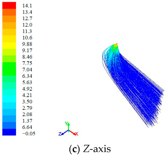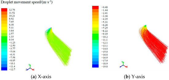 The motion trajectory and velocity distribution of droplets on the X, Y, and Z axes are shown in Figure 13 and Figure 14. Under the conditions of lateral wind speed of 2 m/s and charging voltage of 14 kv, the distribution range of non-electrostatic droplets is 5 × 3 × 2.36 m and the distribution range of electrostatic droplets is 4.37 × 3 × 1.86 m. The results show that the distribution range of droplets under charge is smaller than the ordinary droplets. In addition, the drift of droplets decreases and the effective deposition increases. Under the condition of lateral wind, the electrostatic deflection of droplets position is 2.56–2.71 m in the vertical direction and the electrostatic deflection of droplets position is 1.05–1.2 m in the horizontal direction. The results showed that the lateral wind affected the overall movement trend of droplets, but the inductive charging of charged droplets effectively improved the ability to resist the invasion of lateral wind.