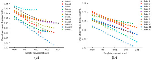 Motion displacement characteristic of droplets by SPSS analysis: (a) Non-electrostatic droplets; (b) electrostatic droplets.