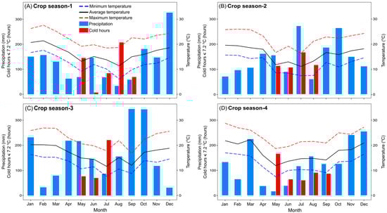 Minimum, average and maximum temperatures (°C), number of chilling hours ≤7.2 °C, and monthly accumulated precipitation (mm) during the growing seasons 1 (A), 2 (B), 3 (C) and 4 (D).