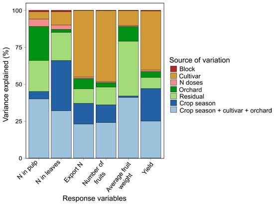 Proportion of variance of each variable explained by each source of variation. The colors represent the source of variation (N doses, crop season, cultivar, orchard, block, residual and the interaction: crop season ∗ cultivar ∗ orchard).