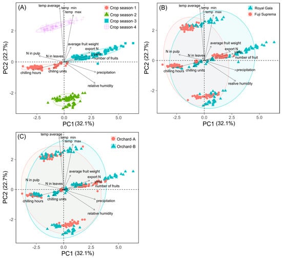 Principal component analysis (multivariate) was used to identify similarity/dissimilarity between the factors “cultivar”, “orchard” and “crop season”, in addition to the relationship between the nutritional variables of plant and climate. Principal components 1 and 2 (PC1 and PC2) explained approximately 55% of the data variance. The analysis showed substantial differences between growing seasons (Figure 4A), small differences between cultivars (Figure 4B), and small differences among orchards (Figure 4C). Among the variables to explain the variation of productivity are climate, including air temperature (minimum, average and maximum), chilling units, rainfall and relative humidity (Figure 4A).