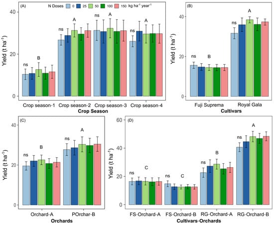 Yield of apple trees subjected to different N rates and its relationship to the “crop season” (A), “cultivar” (B), “orchard” (C) and the “cultivar ∗ orchard” interaction (D). Uppercase letters compare the effects of N application rate for each factor (crop season, cultivar, orchard and cultivar—orchard) using Tukey’s test. Differences were considered significant when p value < 0.05; ns: non-significant at p ≥ 0.05.