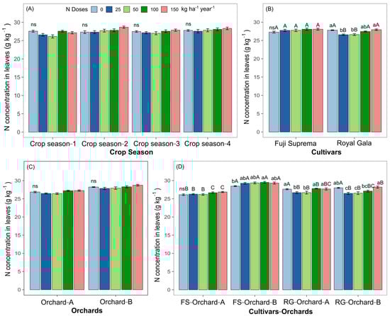 N concentration in apple leaves subjected to different N rates and their relationship with the factors “crop season” (A), “cultivar” (B), “orchard” (C), and the “cultivar * orchard” interaction (D). Lowercase letters compare the means of N doses within the same factor (crop season, cultivar, orchard and cultivar—orchard) and uppercase letters between factors using Tukey’s test. Differences were considered significant when p value < 0.05; ns: non-significant at p ≥ 0.05.