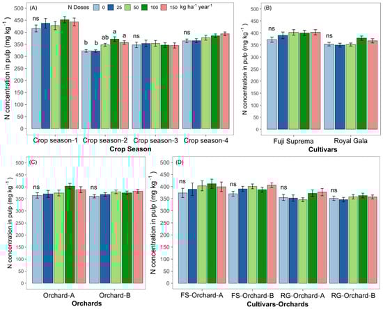 N concentrations in apple fruits (pulp) of two apple cultivars (A–D), grown in two orchards for different seasons and subjected to different N rates. Lowercase letters compare the means of N doses within the same factor (crop season, cultivar, orchard and cultivar—orchard) by Tukey’s test. Differences were considered significant when p value < 0.05; ns: non-significant at p ≥ 0.05.