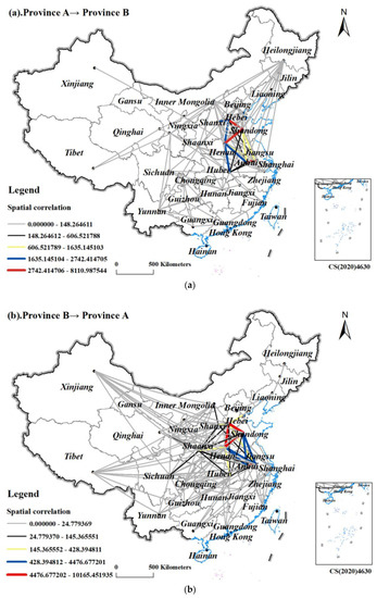 Spatial correlation network of wheat production in China in 2020 ((a,b) reflect the difference in the transmission direction as well as the intensity of the relationship between provinces. (a) Province A → province B; (b) province B → province A).