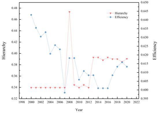 The changes in the level and efficiency of the spatial correlation network of China’s wheat production from 2000 to 2020 are shown in Figure 4. The correlation degree of the inter-provincial wheat production correlation network is one, indicating that there are significant spatial correlations and spillover effects in China’s inter-provincial wheat production. The trend in the network grade contradicts that of the network density. The network level remained stable between 2000 and 2007. After the 2008 financial crisis, the network level began to rise rapidly, and overall network efficiency began to decline. A more stringent and/or gradually formed network level is not conducive to the coordinated development of inter-provincial wheat production. In 2004, the central government issued the No. 1 document on agriculture, rural areas, and farmers, and implemented a new agricultural policy to eliminate agricultural taxes and encourage industry nurturing agriculture [32]. In 2006, the minimum purchase price of wheat was implemented, and agricultural tax was abolished nationwide, resulting in a considerable downward trend in network efficiency. This indicated that the number of connections in the correlation network increased, the multiple superposition effect became increasingly evident, and the stability of the spatial network structure continued to increase [29]. In general, the spatial structure of wheat production with a strict network hierarchy was not disrupted; however, the number of inter-regional wheat production associations steadily increased, and the overall network structure remained stable.