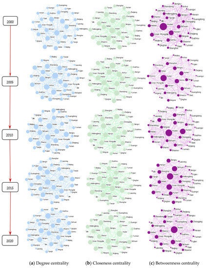 According to the SNA method, the characteristics of an individual network structure can be depicted using network centrality indices, such as degree centrality, betweenness centrality, and closeness centrality, from which the position and role of each member in the network can be determined [28]. Degree centrality measures the degree of centrality of each province in a network based on the number of network connections. The greater the number of connections a province has, the higher its network status, which is reflected in the degree of control it has over others.