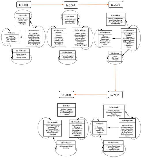 The network density matrix was calculated to investigate the correlations and spillover paths of wheat production between the blocks. By comparing the network density with block density, the blocks with densities greater than the network densities were assigned one; otherwise, they were assigned zero, thus converting the density matrix into an image matrix (Table 5) [6]. For example, in 2020, the overall network density was 0.2598. If the density of a block was greater than 0.2598, the density was set to one in the image matrix; otherwise, the density was set to zero. From the image matrix, the relationships and transmission mechanisms between the wheat production blocks were observed, and a correlation diagram was drawn (Figure 6). The diagonal elements of the image matrix in 2000 and 2005 were all assigned one, indicating that wheat yield had a clear correlation in the blocks and that a club clustering effect was produced.