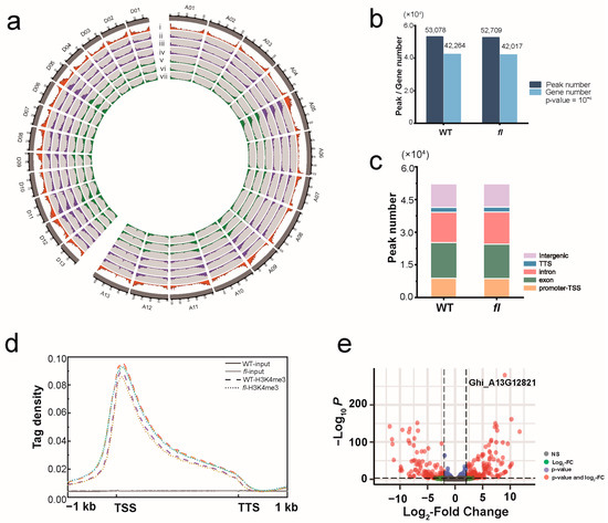Global analysis of H3K4me3 distribution in WT and fl. (a) Overview of H3K4me3 ChIP-Seq signals along the whole genome. i, gene density; ii~iv, H3K4me3 ChIP-Seq signals from 3 replicates in WT; v~vii, H3K4me3 ChIP-Seq signals from 3 replicates in fl. (b) Total peak numbers and gene numbers marked with H3K4me3 in WT and fl of three replicates, p-value = 10−4. (c) Distribution of H3K4me3 in different functional sub-genomic annotations, namely, promoters-TSS (upstream 1 kb to downstream 100 bp), exons, introns, TTS (upstream 100 bp to downstream 1 kb), and distal intergenic regions. (d) Distribution of H3K4me3 along upland cotton genes in WT and fl. A meta-gene profile was generated using the normalized sequencing density of H3K4me3. The gene body was converted into a percentage with the aim to standardize genes of different lengths. The 1 kb upstream and downstream regions of each gene are included. The signals from the duplicates or triplicates are shown. (e) Volcano plots of identified genes covered with H3K4m3 signal in WT and fl, respectively. Genes enriched significantly in either WT or fl are depicted in red (|Fold change| ≥ 2, p-value < 0.05).