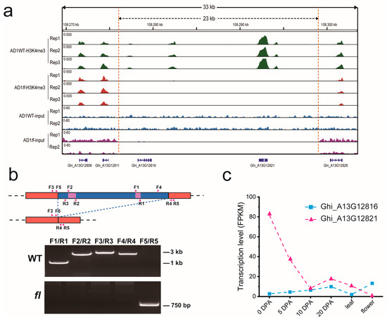 GhTZF2 presented a significant difference between WT and fl. (a) Genomic snapshot of the 23 kb deletion locus on chromosome A13, showing H3K4me3 ChIP-Seq signals (green for WT and red for fl, respectively), and input signals as reference (blue for WT and purple for fl). The approximate 23 kb region between the orange dotted lines indicates the H3K4me3 signal discrepancy resulting from the genomic level between WT and fl. (b) Validation of 23 kb deletion on chromosome A13 via PCR amplification. The region between blue dotted lines indicates the 23 kb region discrepancy mentioned above. The two long red boxes indicate flanked regions in both WT and fl. F1~F5 and R1~R5 show the primer locus on the genomic level. (c) The transcription level (FPKM) of Ghi_A13G12816, Ghi_A13G12821 in WT. Data was collected from transcriptome analysis.