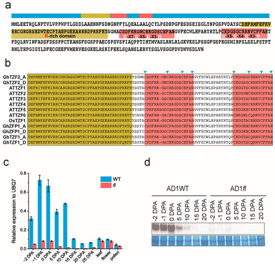 After comparing the genome-wide distribution of H3K4me3, the genes marked with H3K4me3 in WT as well as fl showed a large degree of overlap. However, there are 119 and 80 genes differential marked by H3K4me3 in WT and fl, respectively (log2-fold change ≥ 1, p-value ≤ 0.05, examined in IGV) (Figure 1e, Tables S4 and S5). Among the differentially marked genes, Ghi_A13G12821 had the most considerable difference with H3K4me3 modification between WT and fl: none of the marked signals were found in fl, but it was quite enriched in WT. When visualized in IGV, we found that the gene near Ghi_A13G12821, Ghi_A13G12816, presented the same pattern at the H3K4me3 level between WT and fl. Furthermore, it was noteworthy that the input sample signals indicated that there was a ~23 kb fragment deletion in fl versus WT (Figure 2a). With specific primers, it was confirmed that the ~23 kb fragment deletion existed on Chr_A13 of the fl genome (Figure 2b). Afterwards, Ghi_A13G12816 was predicted as a vacuolar protein sorting-associated protein 32 homolog 2-like, while Ghi_A13G12821 belonged to a plant-specific tandem CCCH zinc-finger (TZF) protein family. Furthermore, it has often been shown that most members of the plant TZF protein family might be associated with specific molecular functions, including DNA and/or RNA binding and protein–protein interactions based on their zinc-finger structure and spacing. It seems that Ghi_A13G12821 might play a much more important role in regulating ovule and/or fiber development. Furthermore, Ghi_A13G12821 presented a higher expression level based on transcriptome data analysis (Figure 2c). Therefore, we chose Ghi_A13G12821 as our target gene for further research. GhTZF2, a name for Ghi_A13G12821, was characterized by a plant-specific RR-TZF feature with two different CCCH domains, C-X7-C-X5-C-X3-H and C-X5-C-X4-C-X3-H, separated by 16 amino acids, as well as a R-rich domain ahead (Figure 3a). When aligned with RR-TZF proteins reported previously in Arabidopsis and rice, they showed quite similar TZF motifs, plus a stretch of extremely conserved 50-amino-acid RR-domain upstream of the TZF motif (Figure 3b and Figure S1).
