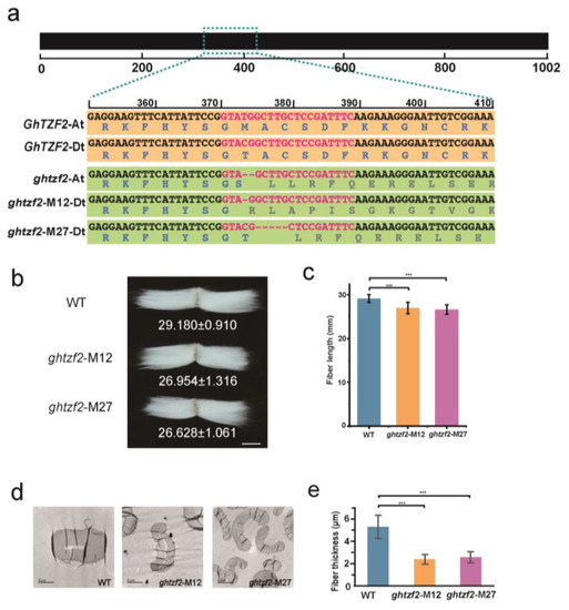 Sequence mutations and morphological alterations in GhTZF2-knockout lines. (a) Sequence identification of both sub-genome At and sub-genome Dt in ghtzf2-M12, ghtzf2-M27, and WT. In every colored box, the upper line shows the DNA sequence and the lower line shows the amino acid sequence. In both two knockout lines, the base deletions introduce frameshift mutation leading to a premature stop codon. (b,c) Comparison of fiber length among WT, ghtzf2-M12, and ghtzf2-M27. The results were calculated with 60 samples each. Error bars indicate ±SD. *** p < 0.001. (d,e) Comparison of mature fiber cell wall thickness of WT, ghtzf2-M12, and ghtzf2-M27. Samples were observed under TEM. The results were calculated with 60 samples each. Error bars indicate ±SD. *** p < 0.001.
