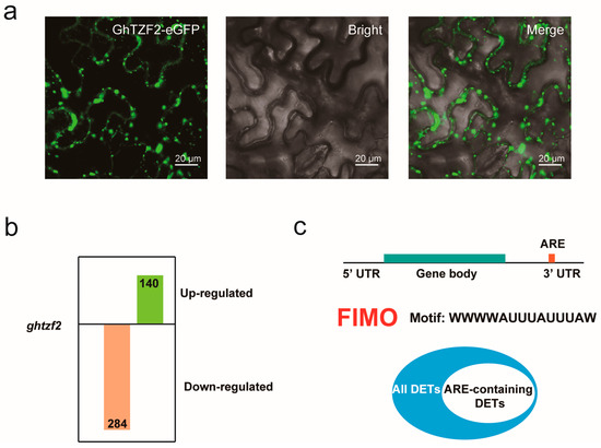 To explore the function of GhTZF2 in plants, we investigated the subcellular localization of GhTZF2. Transient transformation of tobacco leaf epidermal cells is a relatively fast technique to assess the expression of genes of interest. We constructed GhTZF2-eGFP fusion vector under of CaMV 35S promoter and transiently expressed the fusion protein in tobacco leaves. As shown in Figure 6a, green eGFP fluorescence was predominantly accumulated in the cytoplasm shaped as granules with different sizes. It was indicated that GhTZF2 might function in cytoplasmic granules. To further determine the molecular mechanisms by which GhTZF2 affects cotton development, we collected 0 DPA ovules from wild-type and ghtzf2 for RNA sequencing with three replicates. The transcriptome analysis between wild-type and ghtzf2 revealed 424 differentially expressed transcripts (FDR < 0.05; −2 ≥ fold change ≥ 2.0), including 284 down-regulated transcripts and 140 up-regulated transcripts (Figure 6b), suggesting that only a few genes were influenced at the transcription level. RT-qPCR was conducted to validate the reliability of the transcriptome analysis, and results showed that genes identified were indeed down- or up-regulated in GhTZF2-knockout lines as the RNA-Seq data indicated (Figure S4). Among these altered transcripts, we picked their 3’ UTR sequences and searched the ARE motif (“WWWWAUUUAUUUAW”) using FIMO (https://meme-suite.org/meme/tools/fimo, accessed on 16 May 2022). The results showed that about 40% of the transcripts contain ARE-like motifs (Figure 6c). Considering the sub-cellular localization signal from tobacco leaves (Figure 6a), GhTZF2 possibly participates in the formation of cytoplasmic foci and regulates mRNA turnover.