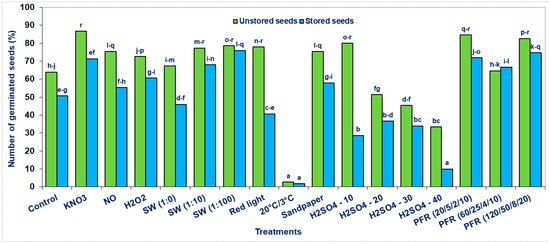 In order to overcome dormancy more effectively, the seeds were subjected to modified stratification (exposure to low temperatures in the presence of compounds), mechanical and chemical scarification or treatments with red light or PRF or warm–cool stratification (20/3 °C). The present study showed that the most advantageous effects of dormancy breakage, with respect to germinability (%), were obtained when unstored seeds were stratified in the presence of KNO3 (0.2%), SW (1:10 and 1:100), NO or scarified with sandpaper or H2SO4 for 10 min or treated with red light or PRF (20/5/2/10 or 120/50/8/20) (Figure 2). Potassium nitrate (KNO3) is a widely used compound to promote germination and break seed dormancy. The concentration of 0.2% KNO3 is commonly recommended by the International Seed Testing Association (ISTA) and the Association of Official Seed Analysts (AOSA) for germination tests of many species [33]. The stimulatory effect of KNO3 application on dormancy breakage can be associated with improving cell wall permeability, thereby increasing the level of cellular metabolism and enzyme activity [34]. It can also be related to extending water absorption by inducing changes in water potential, promoting metabolic activity and auxin biosynthesis in the seeds [35] or changes in the levels of some phytohormones, thereby releasing physiological dormancy [34,36,37]. Grzesik et al. [11] reported that, due to stratification in the presence of KNO3 (0.2%), the dormancy of apple seeds considerably decreased, which was confirmed by the increased percentage and accelerated onset and the end of seed germination. Moreover, seed treatment with KNO3 during stratification significantly increased the physiological activity of seedling cells and tissues, which was expressed by the more significant index of chlorophyll content in the leaves, the activity of stomatal conductance, net photosynthesis, transpiration, and lower intercellular CO2 concentration [11]. Khan et al. [38] reported that this compound might contribute to auxin biosynthesis, ultimately triggering the growth of the embryo. Like in other studies, it can be concluded that KNO3 contributed to a more effective stratification and acted cooperatively or synergistically with stratification.