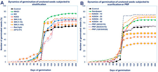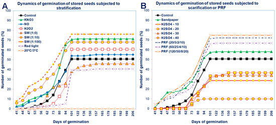 Dynamics of germination of the unstored Saskatoon berry seeds subjected to (A) stratification (3 °C) in the presence of KNO3, NO, H2O2, smoke-water (SW, in concentrations of 1:1, 1:10, 1:100) and 20 °C/3 °C or (B) scarification: sandpaper, sulfuric acid for 10, 20, 30 and 40 min or treatments with red light or pulsed radio frequency (PRF; 20/5/2/10; 60/25/4/10; 120/50/8/20). Values are the means of three replications of 50 seeds.