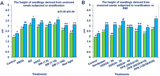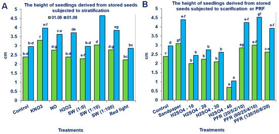 Saskatoon berry seedling heights derived from stored seeds subjected to (A) stratification (3 °C) in the presence of KNO3, NO, H2O2, smoke-water (SW, in concentrations 1:1, 1:10, 1:100), red light or 20 °C/3 °C or (B) scarification: sandpaper, sulfuric acid for 10, 20, 30 and 40 min, or treatments with pulsed radio frequency (PRF, 20/5/2/10, 60/25/4/10, 120/50/8/20). The data within the graph (A or B) and the color of the bar and with the same letter do not differ significantly according to Tukey’s test (5%). Values are the means of three replications of 50 seeds.