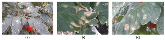Leaves affected for different disease: powdery mildew in tomato (a), early blight in tomato (b) and powdery mildew and early blight in the same tomato leaf (c).