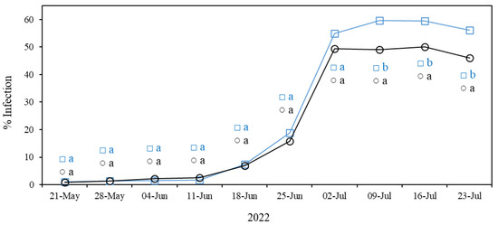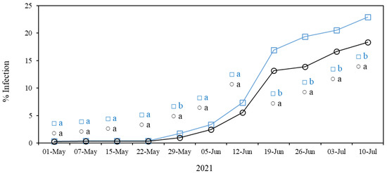 Development of powdery mildew in the pepper: commercial film CF (□); experimental film EF (○). Different letters indicate statistically significant differences (p-value ≤ 0.95).