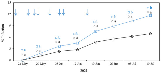 Development of early blight in the tomato: commercial film CF (□); experimental film EF (○). Different letters indicate statistically significant differences (p-value ≤ 0.95). Arrows indicate rainy days.