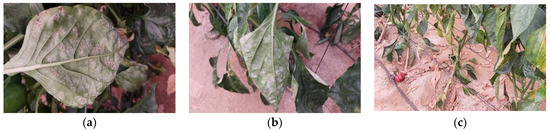 Leaves affected for powdery mildew (a,b) and defoliation leaves in pepper (c).