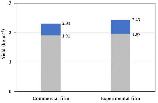 The results for the tomato show an increase in marketable yield of 0.21 kg/m2 in the sector of the greenhouse with the experimental film EF (Figure 5), with an increase of 4.2% compared with the commercial film. Additionally, the total cumulative yield was higher with EF (6.52 kg/m2) in comparison with CF (6.38 kg/m2) (Figure 5). With EF, the total yield was 2.2% higher than with CF.