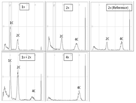 Sample histograms of cytometric analysis of haploid (1x), diploid (2x), mixoploid plants with a haploid and diploid genomes (1x + 2x), tetraploid (4x) plant of the red beet accession 3/2010 and diploid reference plant (donor plant “Czerwona Kula”).