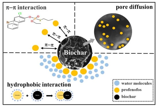 3.4. Adsorption of Profenofos in Biochars by π-π and Hydrophobic Interactions