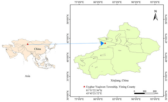 The study was conducted in Yining County, Yili Kazak Autonomous Prefecture, Xinjiang Uygur Autonomous Region, China (81°51′ E, 43°45′ N) (Figure 1). The study site was 903 m above sea level and the climate was a temperate continental climate with a mean annual temperature of 9.3 °C. The total rainfall amounts from June to October during the study periods in 2020 and 2021 were 170.92 mm and 196.44 mm, respectively. Over the past five years, the annual rainfall was 525.41 mm. The orchard covers an area of 4.67 ha, and the land is flat and slope-free. The soil is cultivated to a depth of 60 cm and has a relatively homogeneous texture. The average field water holding capacity of the 0–60 cm soil layer in the test orchard was 22.14%, and the average bulk density was 1.38 g·cm−3; the basic fertility of the 0–60 cm soil layer was 9.47 g·kg−1 organic matter, 0.62 g·kg−1 total nitrogen, 0.62 mg·kg−1 ammonium nitrogen, 5.91 mg·kg−1 nitrate nitrogen, 4.53 mg·kg−1 available phosphorus, and 77.86 mg·kg−1 available potassium.