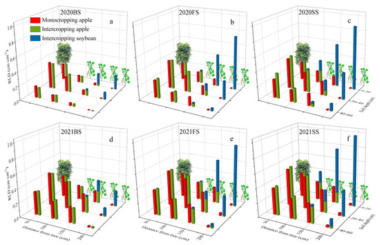 Interspecific facilitation through the spatial distribution of root systems of constituent species has been suggested to enhance grain yield and nutrient uptake [36,37,38]. Under the traditional definition of fine roots, fine roots can be further divided into absorbing and transporting roots based on their function [39]. Root distribution plays an important role in the interaction between species within an intercropped field. In such fields, the root distribution of different species differs in time and space, and there is interspecific competition for resources (e.g., soil water and nutrients), which is very different from monoculture fields [40]. In this study, intercropping reduced the FRLD of apple and increased the overall FRLD of the system, with the differences between monoculture and intercropping concentrated at FS and SS. In the area not covered by soybean (at T50 and T100), intercropping increased FRLD of apple and the increase was greater in the 20–60 cm soil layer, while in the area covered by soybean (at T150 and T200), intercropping reduced FRLD of apple, and the reduction was greater in the 0–40 cm soil layer. Soybean cover in the field resulted in the overlapping of apple roots with soybean roots in the cover area, probably due to competition for resources resulting in more distribution of apple fine roots in the uncovered area of soybean and movement to deeper soil layers, which is direct evidence of changes in fine root distribution in apple–soybean intercropping systems, where competition is unavoidable and plants promote root development in deeper soils to take up more water and nutrients [1]. As the root system of apple trees developed, the distribution of apple tree fine roots in the 20–60 cm soil layer increased in 2021 compared to 2020, leading to a change in the distribution of fine roots in soybean in 2021 compared to 2020, with an increase in the distribution of fine roots in soybean in the 0–20 cm soil layer and a decrease in FRLD in the 20–60 cm soil layer. In addition, the T100 was the location of the greatest overlap in fine root length density between apple and soybean, which separated the dominant areas of the two species in the lower ground, with decreasing FRLD in apple with increasing distance from the tree and the opposite in soybean, a root distribution pattern that reduces below-ground competition between species and improves the utilization of deep soil resources [41]. The difference in FRLD between intercropping and monocropping apples was reduced during the recovery period from fall to spring, while the rapid growth of soybean roots was from spring to summer, and this difference in root growth time helped to reduce competition between species and improve resource utilization [17].