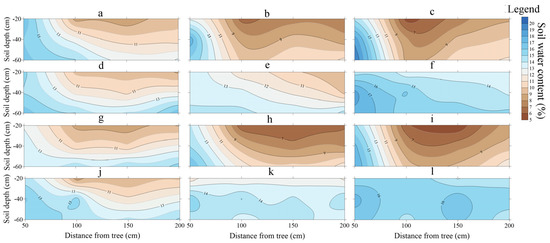 Two–dimensional SWC distribution in different growth stages of MA and AS system. (left: a,d,g,j) Soybean branching stage; (b,e,h,k) soybean flowering-podding stage; (right: c,f,i,l) seed filling stage; 2020 MA (a–c), 2020 AS (d–f), 2021 MA (g–i), 2021 AS (j–l).
