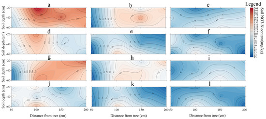 Two–dimensional soil NO3−−N content distribution in different growth stages of MA and AS systems. (left: a,d,g,j) Soybean branching stage; (b,e,h,k) soybean flowering-podding stage; (right: c,f,i,l) seed filling stage; 2020 MA (a–c), 2020 AS (d–f), 2021 MA (g–i), 2021 AS (j–l).