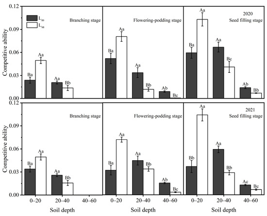 Competitiveness index of apple–soybean agroforestry system in the vertical direction. Las: competitiveness index of apple to soybean; Lsa: competitiveness index of soybean to apple. Lowercase letters indicate the significance analysis of different soil depths of the same species (p < 0.05). Capital letters indicate the significance analysis of the same soil depth for different species (p < 0.05).