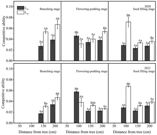 Competitiveness index of apple–soybean agroforestry system in the horizontal direction. Las: competitiveness index of apple to soybean; Lsa: competitiveness index of soybean to apple. Lowercase letters indicate the significance analysis of different soil depths of the same species (p < 0.05). Capital letters indicate the significance analysis of the same soil depth for different species (p < 0.05).